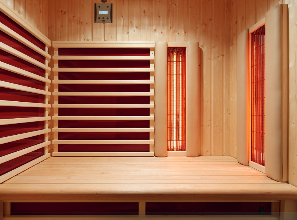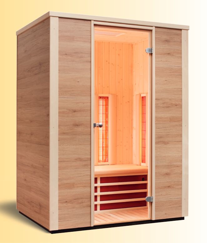 Diese Infrarotkabine wird in trendigem Eiche-Dekor und nordischer Fichte gefertigt. Zusätzlich zum innovativen Flächenheizsystem sind zwei VITALlight-ABC-Strahler als VITALcorner eingebaut
