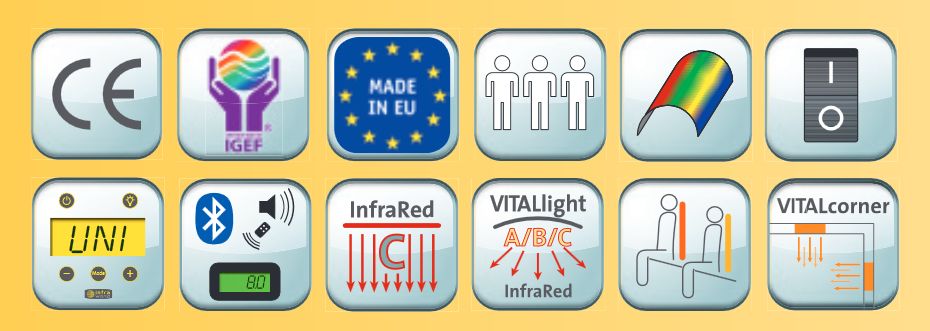 - Heizelemente: 3 Flächenheizungselemente, 2 VITALlight-ABC-Strahler im VITALcorner