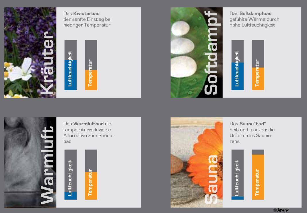 Entspannung findet jeder auf seine Art – und es muss nicht immer dieselbe sein. Die Klimaöfen von Arend bieten Ihnen die gewünschte Abwechslung. Dank integriertem Verdampfer lassen sich, anders als in der finnischen Sauna, Temperatur und Luftfeuchtigkeit individuell regeln. Stufenlos. Besonders beliebte Badeformen: Kräuter-, Softdampf-, Warmluft- und Saunabad. Ob heiß und trocken oder mild und feucht: Erleben Sie in jeder Stimmung ein unvergessliches Badeerlebnis.