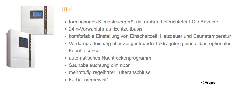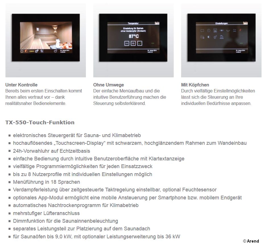Durch die Arend-Klimasysteme wird Ihre Sauna noch vielseitiger einsetzbar. Denn niedrigere Temperaturen, auch in Kombination mit erhöhter Luftfeuchtigkeit, sind z. B. ideal für Kinder und empfindliche Personen. Damit Sie bei so vielen Entscheidungsmöglichkeiten nicht schon vor dem ersten Saunagang ins Schwitzen geraten, haben wir die Bedienung unserer Klimaöfen übrigens ganz einfach gemacht.