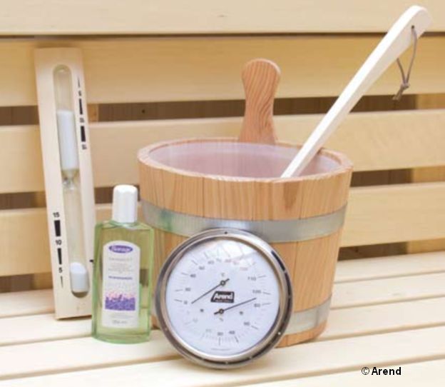 Was jetzt noch fehlt zum Glücklichsein: Aufgusskübel und Schöpfkelle, Sanduhr und Thermo-Hygrometer sowie ein wohlriechender Saunaduft sind unverzichtbare Accessoires der gepflegten Bäderkultur –