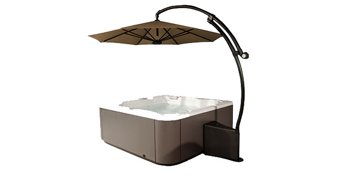Der Sonnenschirm Spa besteht aus einem Fuß, in dem sich der Sonnenschirm leicht im Spa befestigen lässt, einem ausziehbaren Arm, um den Sonnenschirm bis zur gewünschten Stelle zu verschieben, und hat einen Schirmdurchmesser von 275 cm.