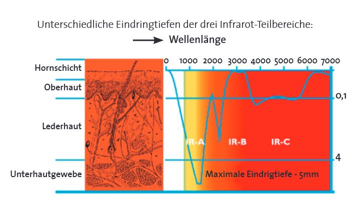 Infrarot A-Bereich: bis max. 5 mm möglich (Unterhaut, Subcutis) Infrarot B-Bereich: bis 0,5 mm (Oberhaut, Lederhaut, Epidermis, Dermis) Infrarot C-Bereich: bis 0,1 mm (Hornschicht, Keimschicht, Epidermis)